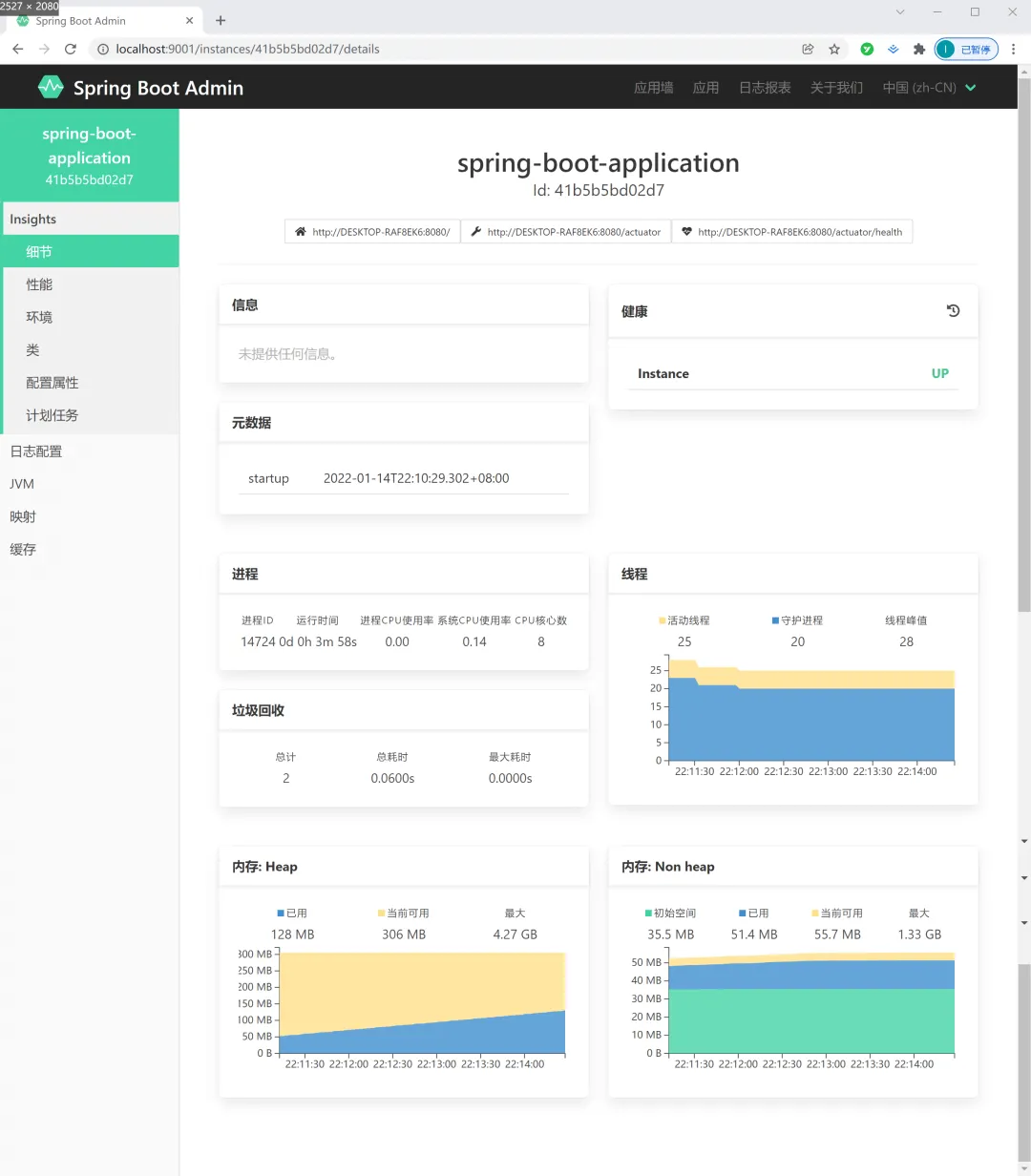以上的配置是开放监控所有选项,配置完之后,重启此 Spring Boot 项目,然后再刷新 Spring Boot Admin 更多的监控项就展示出来了,如下图所示: