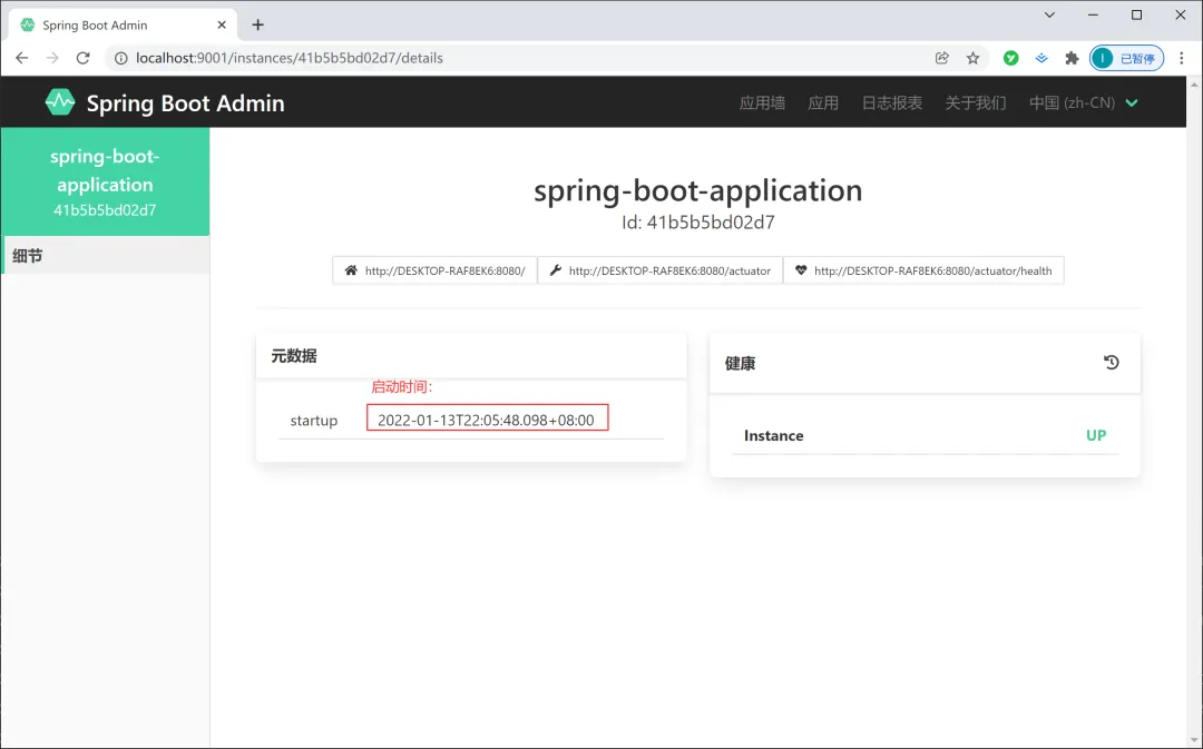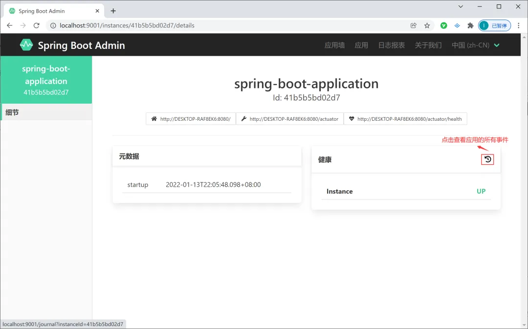 配置完以上信息之后,此时查看 Spring Boot Admin 页面中就有被监控的 Spring Boot 项目了,如下图所示: 也可以点击“应用墙”查看 Spring Boot Admin 中所有被监控的 Spring Boot 项目,如下图所示: 点击应用进入详情页面,如下图所示: 事件日志中包含 Spring Boot 各种状态的展示(UP 为正常、OFFLINE 为异常)和发生的时间,如下图所示:
