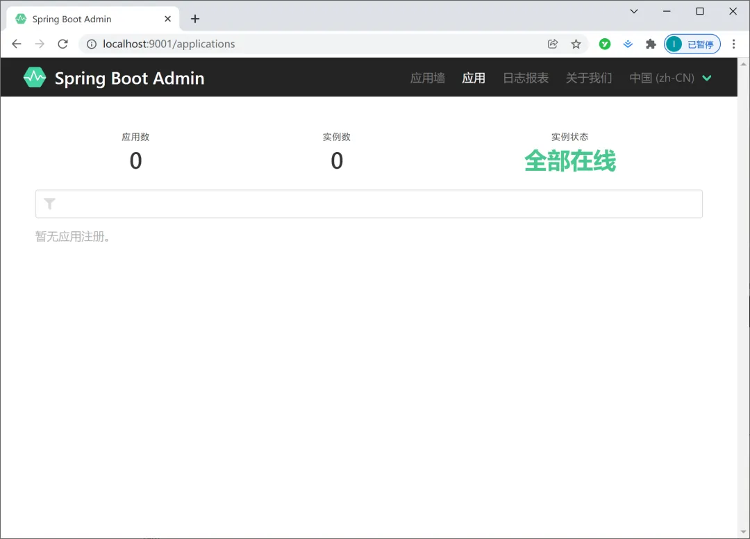 启动项目之后,就可以看到 SBA 的主页了,如下图所示: 此时 SBA 中还没有添加任何需要监控的项目,接下来再创建一个 Spring Boot 项目,加入到 SBA 中来进行监控和管理吧。