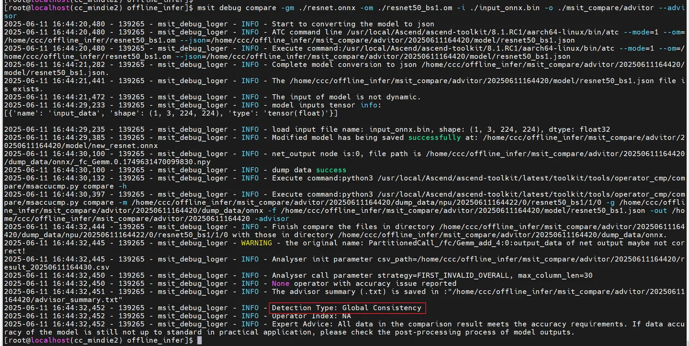msit debug compare -gm ./resnet.onnx -om ./resnet50_bs1.om -i ./input_onnx.bin -o ./msit_compare/advisor --advisor