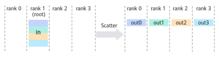 Scatter:将通信域内root节点的数据均分并散布至其他rank