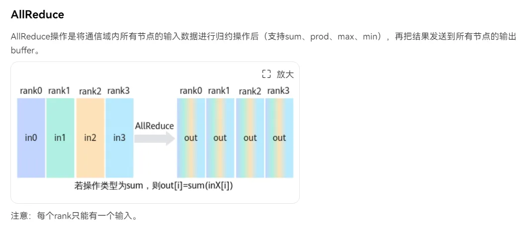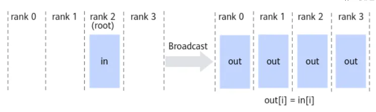 Broadcast:将通信域内root节点的数据广播到其他rank