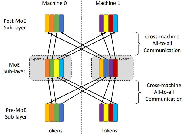 专家并行是在分布式学习中专门针对MoE场景的并行策略,其主要思想就是将不同专家放在不同计算节点上进行并行计算。专家并行与之前所有的并行相比,最大的不同在于,输入数据需要通过一个动态的路由选择机制分发给相应专家,此处会涉及到一个所有节点上的数据重分配的动作,然后在所有专家处理完成后,又需要将分散在不同节点上的数据按原来的次序整合起来。