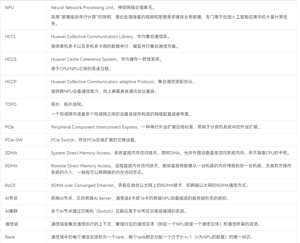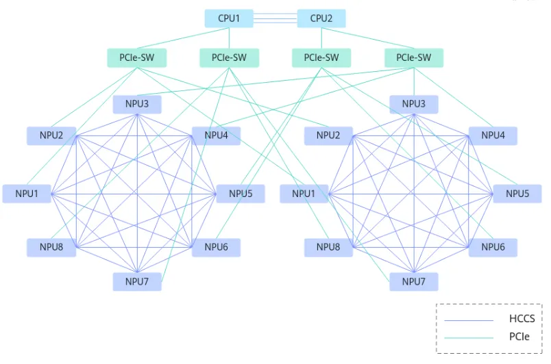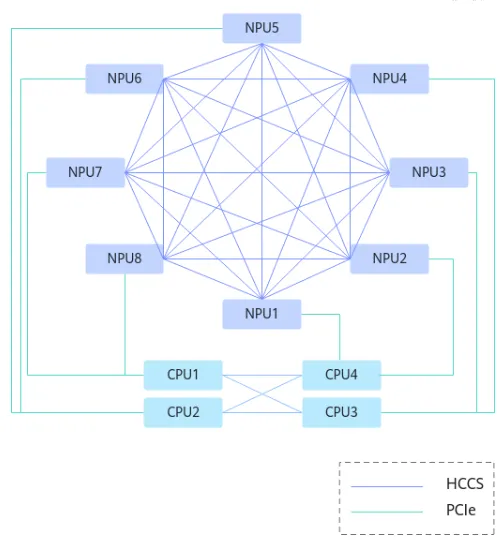 通过HCCS实现两两互联(Full Mesh),如NPU与NPU之间,CPU与CPU之间;NPU和CPU之间通过PCIE连接。