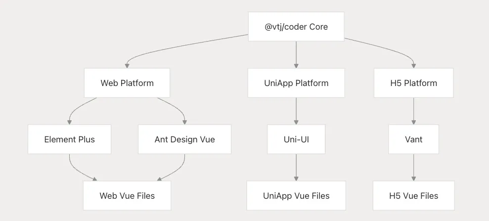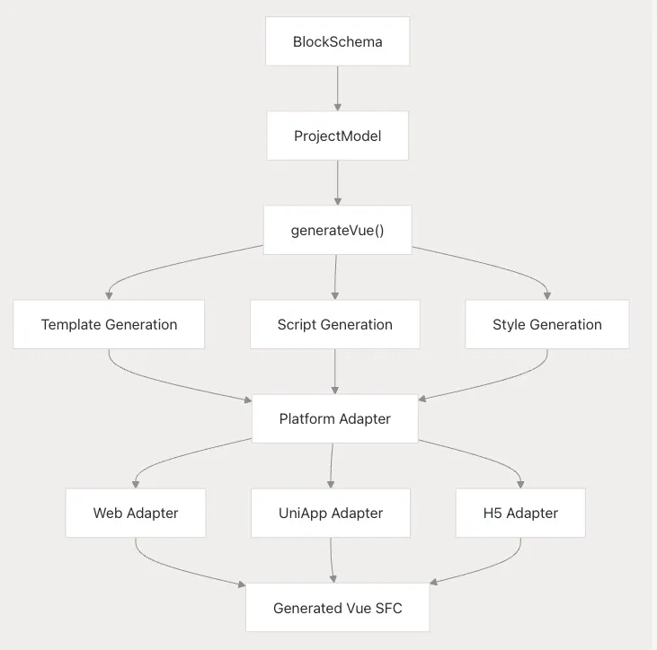 代码生成管道将 VTJ 的内部 DSL 转换回针对不同目标平台的可部署的 Vue 单文件组件。