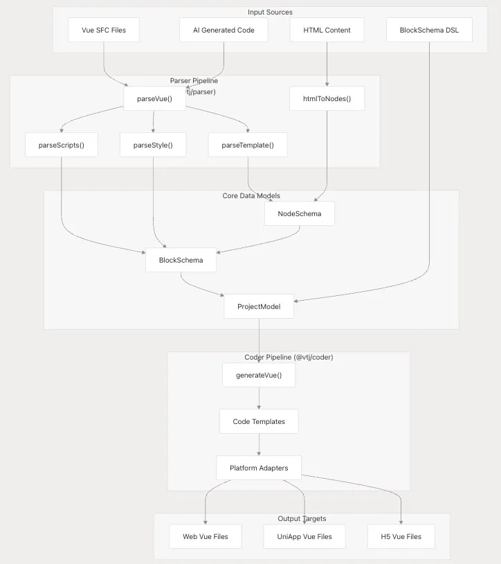 代码生成和解析管道构成了 VTJ 的 AI 增强开发工作流程的支柱,支持人类可读的 Vue 代码和机器可处理的 DSL 表示之间的转换。