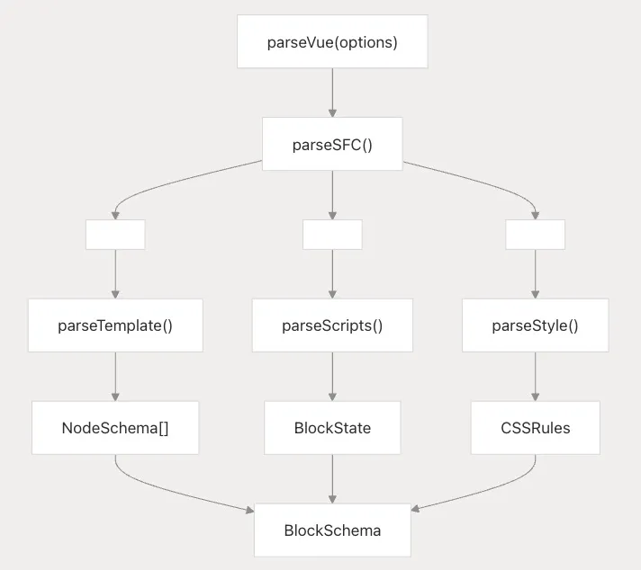 ParseVueOptions 接口定义了所需的输入,包括目标项目上下文、块标识符和源代码。