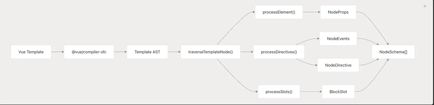 模板解析使用 Vue 的编译器基础设施将 Vue 模板语法转换为 NodeSchema 结构: