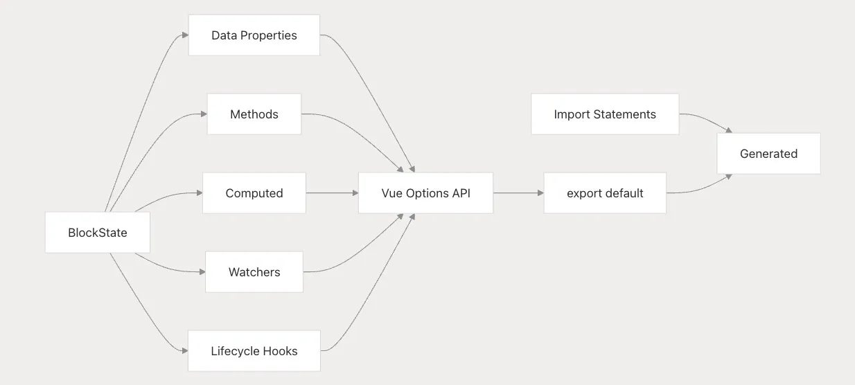 脚本生成从 BlockState 表示中重建 Vue 组件逻辑: