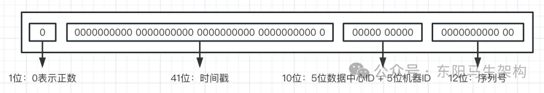 第一个bit不用,接下来的41个bit用来存储毫秒时间戳,再接下来的10个bit用来存储机器ID,剩余的12个bit用来存储流水号和0。