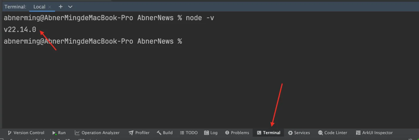 鸿蒙开发是需要node环境的,一般不需要我们在额外配置,在下载DevEco Studio的时候会自行配置,为了验证node环境是否存在,我们可以在DevEco Studio底部终端,输入node -v,如果能正确显示出版本号,则有node环境。