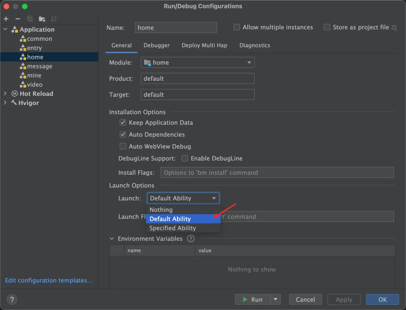 以上执行完之后,如果你的模块,没有设置默认的启动Launch,需要手动配置一次,仅第一次配置,如果已经配置了,则会直接运行到设备上。