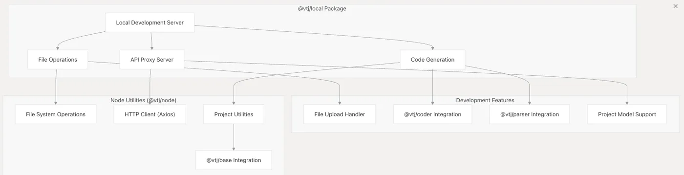 | @vtj/local | 具有 API 代理的本地开发服务器 | 开发服务器、文件作、代码生成 |
