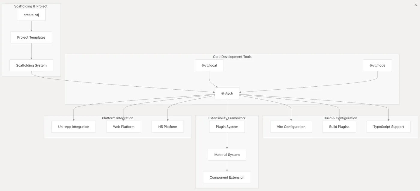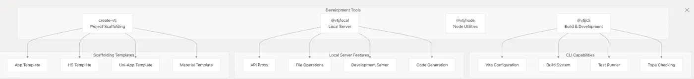 VTJ 开发人员工具生态系统是围绕多个专用软件包构建的,这些软件包协同工作以提供完整的开发体验。这些工具与 Vite、TypeScript 和 Vue 等现代前端技术集成,为平台开发和扩展创建优化的工作流程。