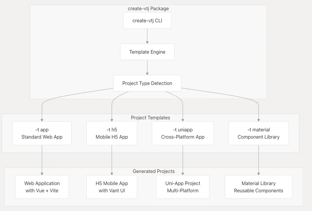 VTJ 平台通过 create-vtj 软件包包括一个复杂的项目基架系统,该系统为不同类型的 VTJ 应用程序提供基于模板的项目创建。