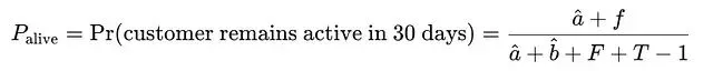 BG/NBD模型的核心在于通过Beta-几何共轭先验,从购买频率f、新近度r和观察时间跨度T中估计生存概率: