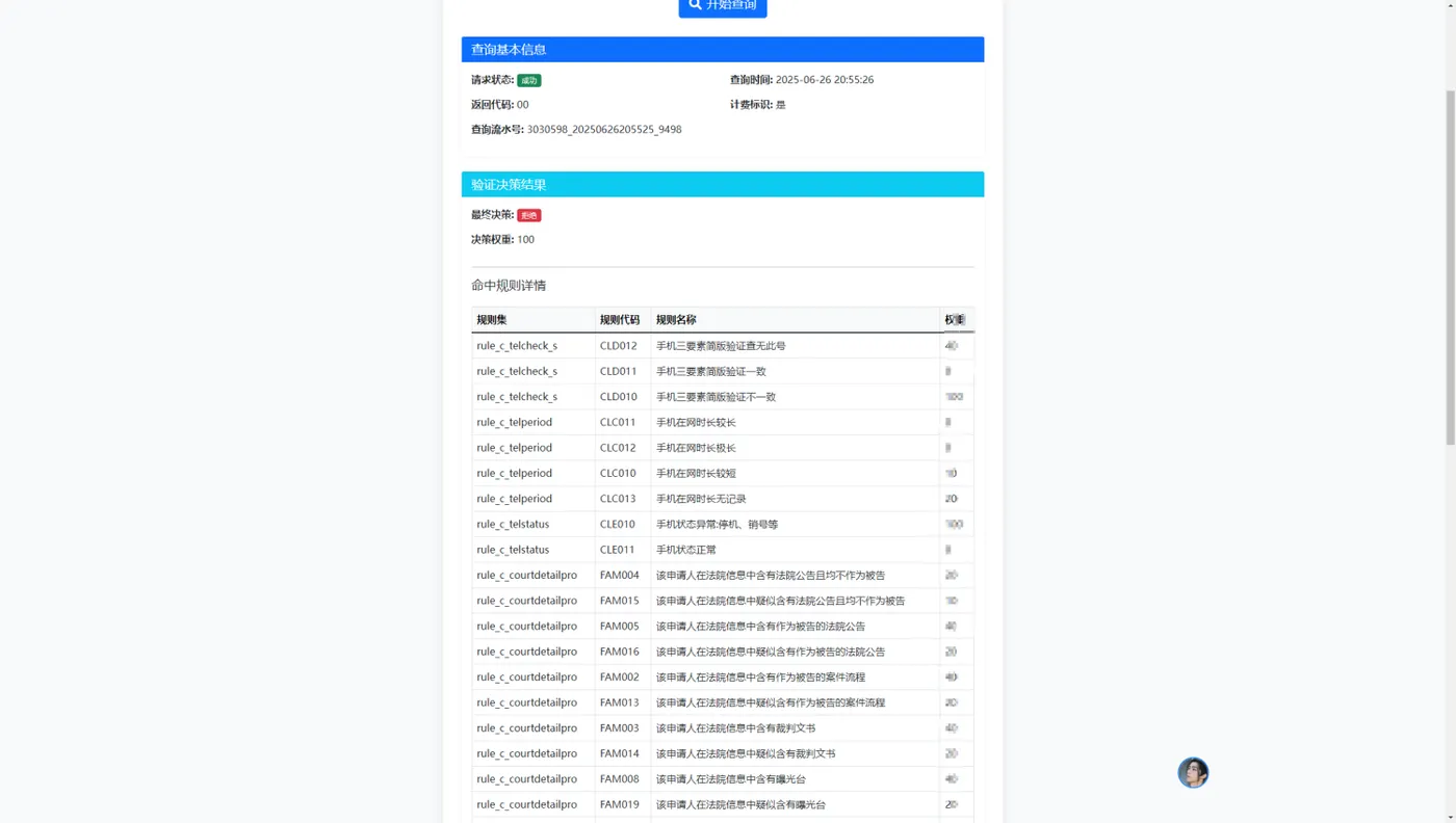 // 特殊名单检查结果 if (isset($result['SpecialList_c'])) { $specialList = $result['SpecialList_c']; $output .= '<div class="card mb-4">'; $output .= '<div class="card-header bg-warning text-dark">'; $output .= '<h5 class="mb-0">特殊名单检查</h5>'; $output .= '</div>'; $output .= '<div class="card-body">'; $output .= '<div class="row">'; // 身份证相关检查 if (isset($specialList['id'])) { $output .= '<div class="col-md-6">'; $output .= '<h6>身份证检查结果</h6>'; $output .= '<ul class="list-group">'; $output .= '<li class="list-group-item d-flex justify-content-between align-items-center">'; $output .= '法院不良记录'; $output .= '<span class="badge ' . ($specialList['id']['court_bad'] == '1' ? 'bg-danger' : 'bg-success') . '">'; $output .= $specialList['id']['court_bad'] == '1' ? '存在' : '无'; $output .= '</span>'; $output .= '</li>'; $output .= '<li class="list-group-item d-flex justify-content-between align-items-center">'; $output .= '法院执行记录'; $output .= '<span class="badge ' . ($specialList['id']['court_executed'] == '1' ? 'bg-danger' : 'bg-success') . '">'; $output .= $specialList['id']['court_executed'] == '1' ? '存在' : '无'; $output .= '</span>'; $output .= '</li>'; $output .= '<li class="list-group-item d-flex justify-content-between align-items-center">'; $output .= '银行不良记录'; $output .= '<span class="badge ' . ($specialList['id']['bank_bad'] == '1' ? 'bg-danger' : 'bg-success') . '">'; $output .= $specialList['id']['bank_bad'] == '1' ? '存在' : '无'; $output .= '</span>'; $output .= '</li>'; $output .= '</ul>'; $output .= '</div>'; } // 手机号相关检查 if (isset($specialList['cell'])) { $output .= '<div class="col-md-6">'; $output .= '<h6>手机号检查结果</h6>'; $output .= '<ul class="list-group">'; $output .= '<li class="list-group-item d-flex justify-content-between align-items-center">'; $output .= '银行不良记录'; $output .= '<span class="badge ' . ($specialList['cell']['bank_bad'] == '1' ? 'bg-danger' : 'bg-success') . '">'; $output .= $specialList['cell']['bank_bad'] == '1' ? '存在' : '无'; $output .= '</span>'; $output .= '</li>'; $output .= '<li class="list-group-item d-flex justify-content-between align-items-center">'; $output .= '银行逾期记录'; $output .= '<span class="badge ' . ($specialList['cell']['bank_overdue'] == '1' ? 'bg-warning text-dark' : 'bg-success') . '">'; $output .= $specialList['cell']['bank_overdue'] == '1' ? '存在' : '无'; $output .= '</span>'; $output .= '</li>'; $output .= '<li class="list-group-item d-flex justify-content-between align-items-center">'; $output .= '银行欺诈记录'; $output .= '<span class="badge ' . ($specialList['cell']['bank_fraud'] == '1' ? 'bg-danger' : 'bg-success') . '">'; $output .= $specialList['cell']['bank_fraud'] == '1' ? '存在' : '无'; $output .= '</span>'; $output .= '</li>'; $output .= '</ul>'; $output .= '</div>'; } $output .= '</div>'; // 结束row $output .= '</div>'; // 结束card-body $output .= '</div>'; // 结束card }