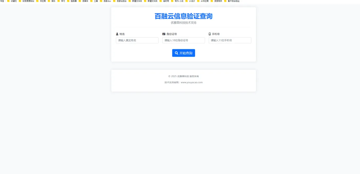 <!-- 查询表单 --> <form method="post"> <div class="row"> <div class="col-md-4"> <div class="form-group"> <label for="name" class="form-label"><i class="fas fa-user me-2"></i>姓名</label> <input type="text" class="form-control" id="name" name="name" required placeholder="请输入真实姓名"> </div> </div> <div class="col-md-4"> <div class="form-group"> <label for="id_number" class="form-label"><i class="fas fa-id-card me-2"></i>身份证号</label> <input type="text" class="form-control" id="id_number" name="id_number" required placeholder="请输入18位身份证号"> </div> </div> <div class="col-md-4"> <div class="form-group"> <label for="phone" class="form-label"><i class="fas fa-mobile-alt me-2"></i>手机号</label> <input type="text" class="form-control" id="phone" name="phone" required placeholder="请输入11位手机号"> </div> </div> </div> <div class="text-center mt-3"> <button type="submit" class="btn btn-primary btn-lg"> <i class="fas fa-search me-2"></i>开始查询 </button> </div> </form>