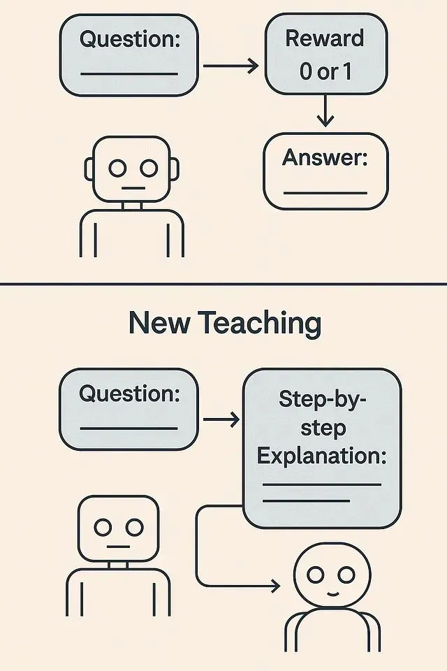 强化学习教师模型(RLT)从根本上重新定义了训练范式。与传统方法要求模型自主解决问题不同,RLT预先提供问题的解决方案。在训练过程中,RLT教师模型同时接收问题和正确答案作为输入。教师的任务不是重新发现答案,而是解释为什么该答案是正确的。这类似于优秀的人类教师无需在每堂课上重新推导已知定理,而是专注于清晰地解释其原理。