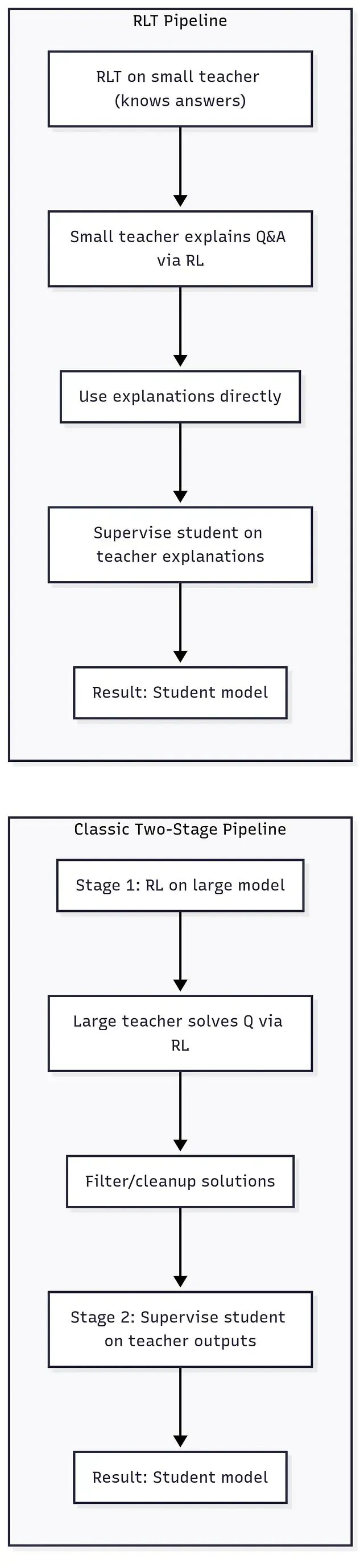 RLT论文中的一个重要发现是,RLT教师的原始输出(无需任何过滤或人工编辑)就足以训练学生并超越之前使用更大教师加仔细过滤的蒸馏流程。因此,RLT本质上自动化了曾经劳动密集型的SFT数据收集过程。从这个角度来看,RLT并非完全替代SFT,而是对其的增强。典型的流程可能是:初始SFT进行模型初始化,然后通过强化学习改进教师,最后再次使用SFT在教师输出上训练最终的学生模型。