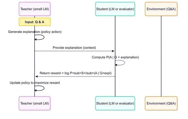 这种方法被称为"学习教学"范式。核心思想是使用专门设计的奖励函数来训练教师,该奖励函数衡量教师的解释对帮助学生模型理解解决方案的有效性。具体的训练循环包括以下步骤: