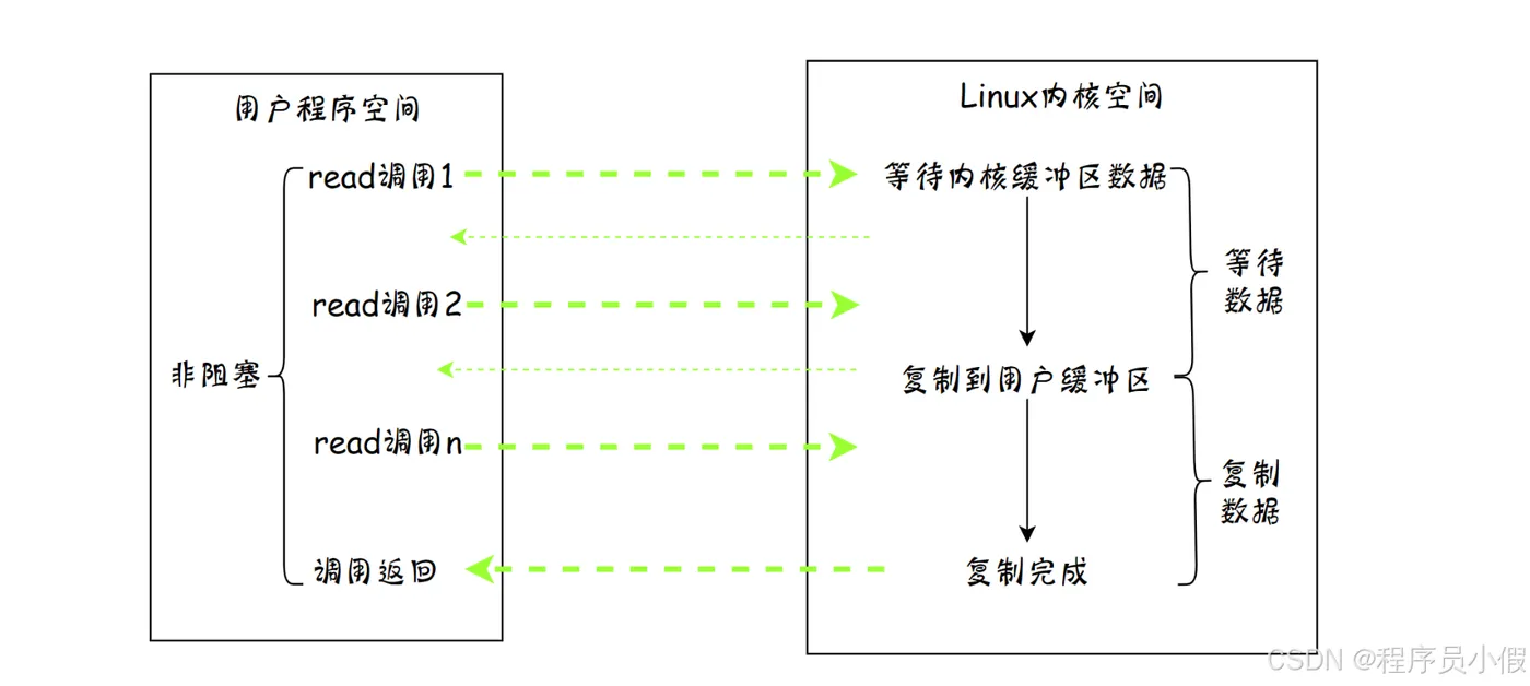 (1)在内核数据没有准备好的阶段,用户线程发起IO请求时,立即返回。用户线程需要不断地发起IO系统调用。