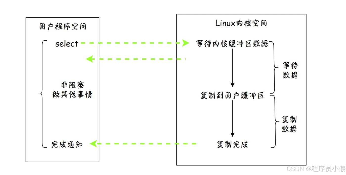 kernel的数据准备是将数据从网络物理设备(网卡)读取到内核缓冲区;kernel的数据复制是将数据从内核缓冲区拷贝到用户程序空间的缓冲区。