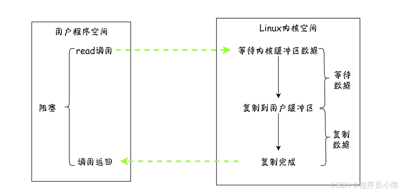 在linux中的Java进程中,默认情况下所有的socket都是blocking IO。在阻塞式 I/O 模型中,应用程序在从IO系统调用开始,一直到到系统调用返回,这段时间是阻塞的。返回成功后,应用进程开始处理用户空间的缓存数据。