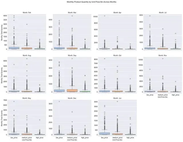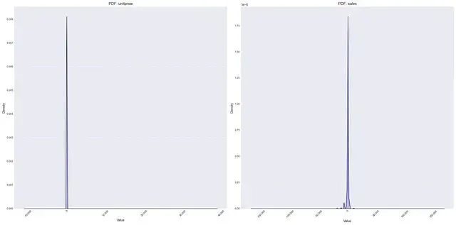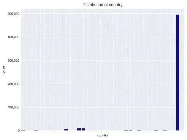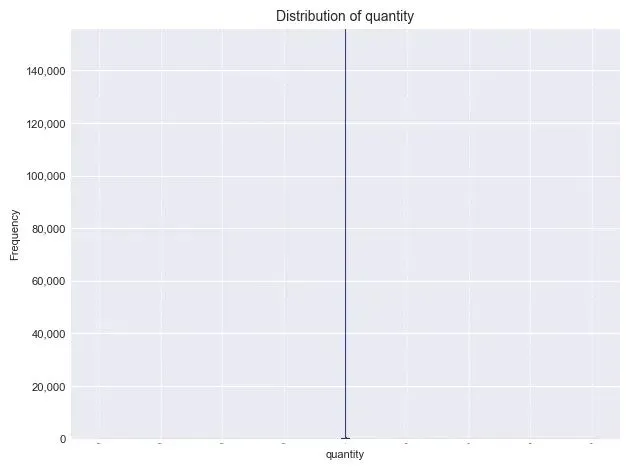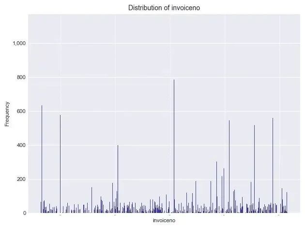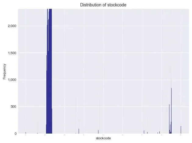 stockcode在左侧呈现峰值,右侧呈现长尾分布,而quantity和country显示退化分布,数据集中在少数几个类别:
