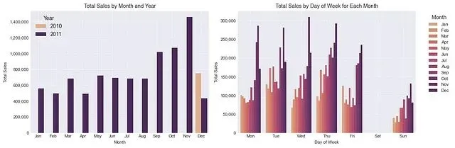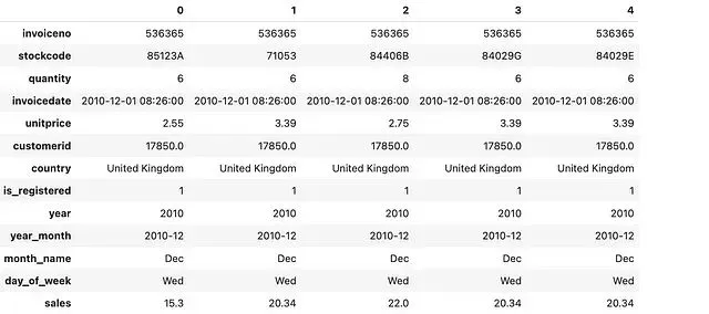 为了准备EDA,首先从invoicedate列中提取year、month、day_of_week特征,并按invoicedate顺序对数据进行排序: