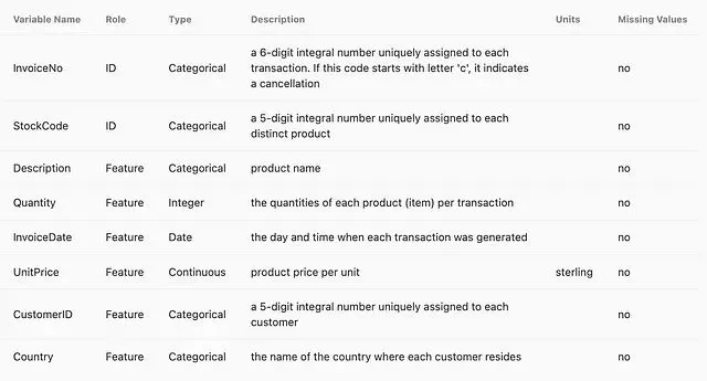 这是数据准备阶段的核心环节。实验使用来自UC Irvine机器学习存储库的在线零售数据集,该数据集采用知识共享署名4.0国际(CC BY 4.0)许可协议。