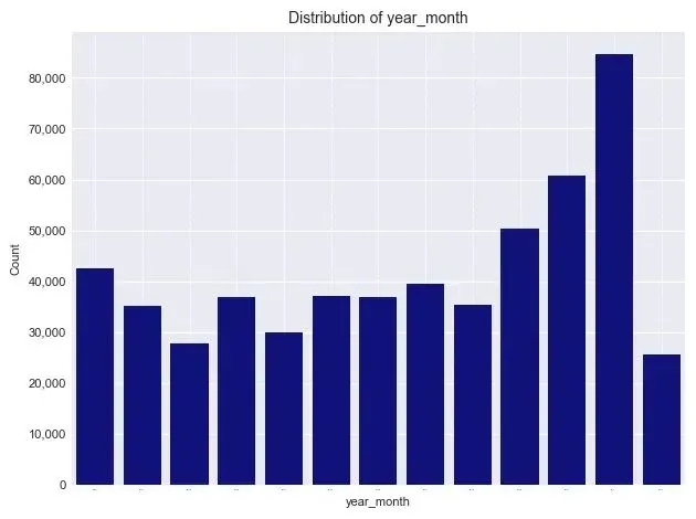 invoiceno、year_month和day_of_week呈现相对均匀的分布: