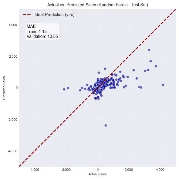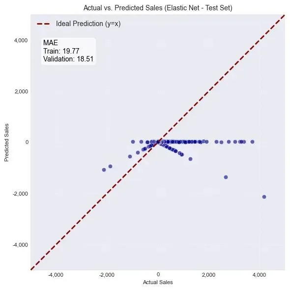 弹性网络表现出良好的泛化能力(19.77训练,18.51验证),但具有最高的平均误差。其预测与实际销售的偏差约为18.50到19.77。