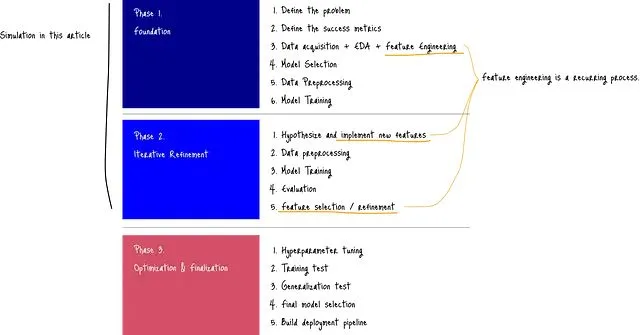虽然不存在适用于所有情况的通用方法,但特征工程的一般工作流程通常涵盖整个项目生命周期,从问题定义和成功指标制定开始。本文将重点演示第一阶段和第二阶段的实施过程,特别关注特征工程的具体应用。