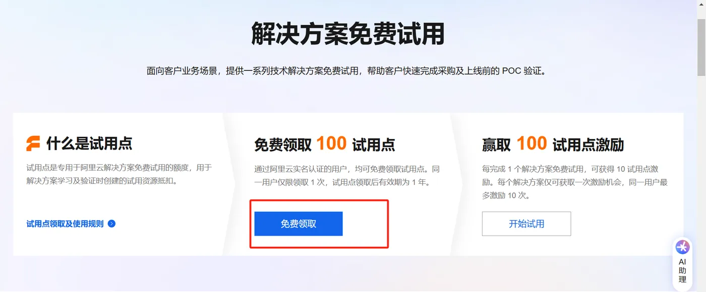 在了解了试用点的由来之后,我们就可以领取试用点,试用点领取位置也就是解决方案的权益地址:https://www.aliyun.com/solution/free 直接点击解决方案免费试用页面的【免费领取】就可以领取你的解决方案专属试用点
