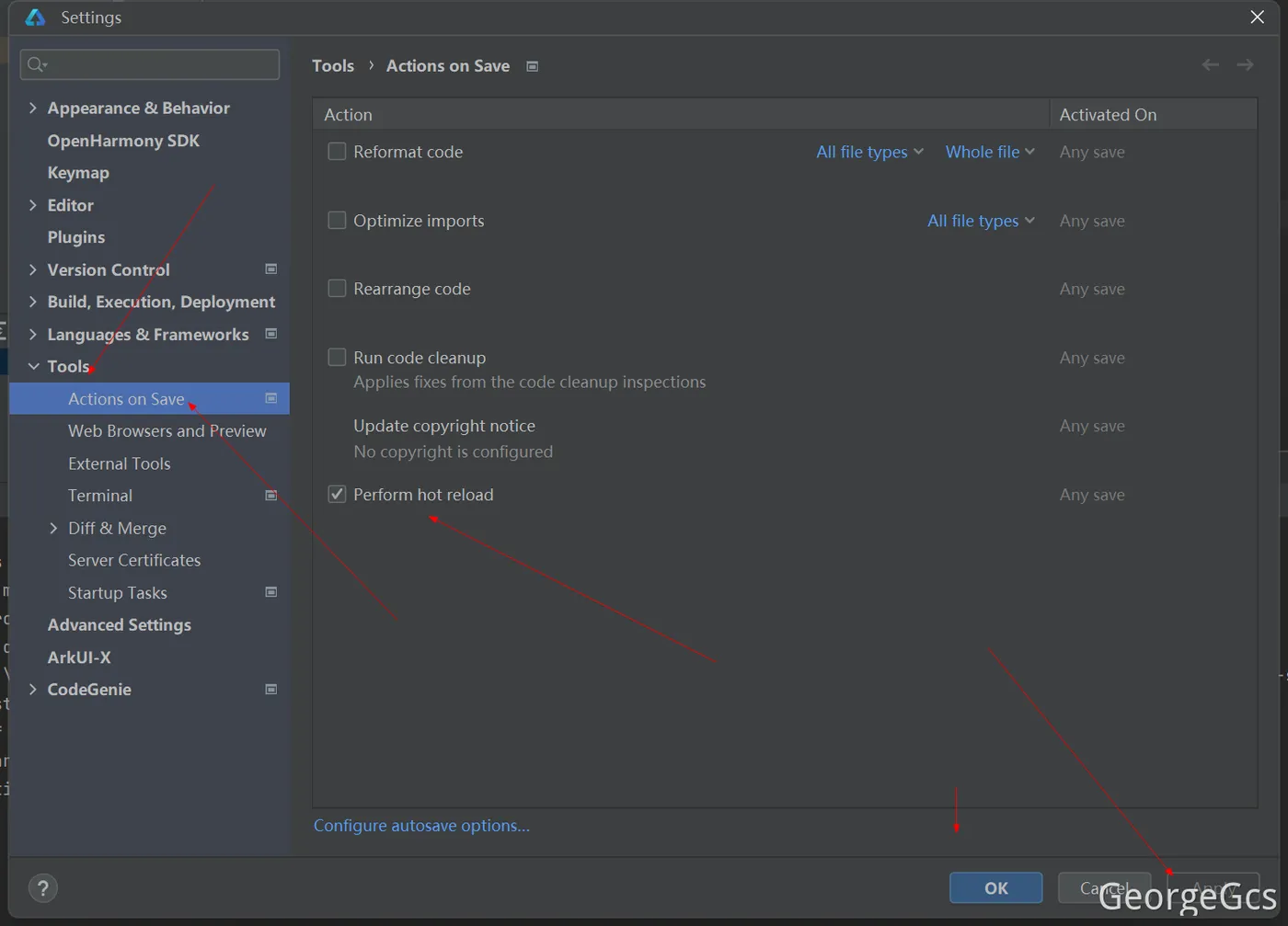 需要先在菜单栏点击File > Settings,选择Tools > Actions on Save,勾选Perform hot reload,点击OK完成设置。修改代码后通过快捷键Ctrl + S即可触发Hot Reload。