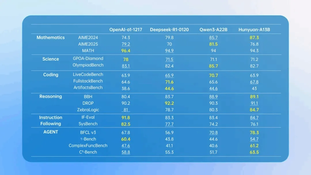 基于先进的模型架构,Hunyuan-A13B表现出强大的通用能力,在多个业内权威数据测试集上获得好成绩,并且在Agent工具调用和长文能力上有突出表现。