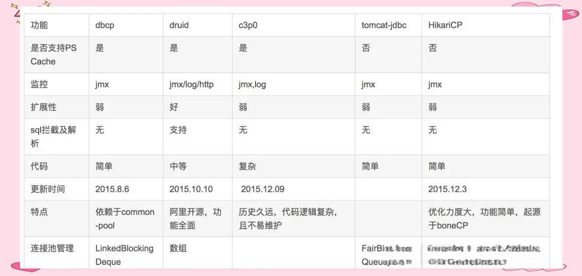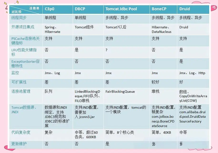 在数据库连接池领域,众多开源选项中,C3P0、DBCP、Tomcat Jdbc Pool、BoneCP以及Druid等备受瞩目。C3P0,作为一款轻量级的JDBC连接池,不仅实现了数据源与JNDI的绑定,还支持JDBC3规范及JDBC2的标准扩展。其轻巧的代码体积,约为600KB,适用于小型系统。然而,单线程性能限制了它在大型系统中的应用。