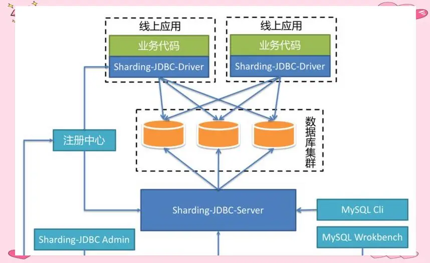 线上应用通过Sharding-JDBC-Driver直接连接数据库,从而获得最佳的性能。同时,可以使用MySQL命令行或UI客户端轻松连接Sharding-JDBC-Server,以便于查询数据和执行各种DDL语句。所有组件都共享同一个注册中心集群,管理员可以通过管理端配置注册中心中的数据,注册中心将自动将配置更改推送给Driver和Server应用。如果数据库拆分过多导致连接数激增,可以考虑直接在线上使用Sharding-JDBC-Server,这样能够有效控制连接数。此外,即将面世的Sharding-JDBC-Sidecar也将为部署提供更多选择。