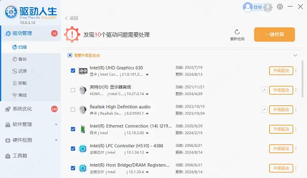 启动驱动人生,点击首页的【立即扫描】按钮。程序会自动检测你电脑上的硬件驱动。