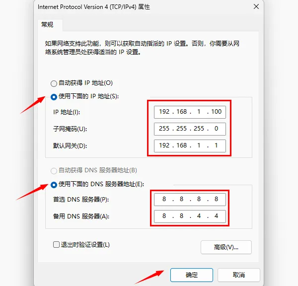 选择“使用以下IP地址”,并输入以下信息(适用于大多数家庭网络):