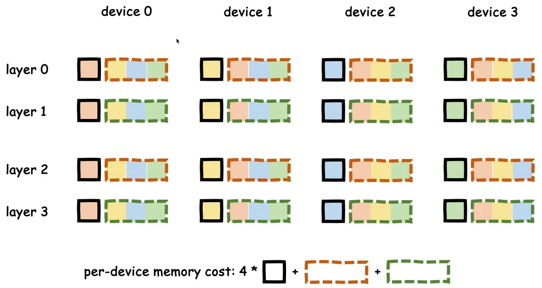 - 私有显存区(每卡固定):存储本地权重分片(图3实线块),总大小为weight / dp_size。