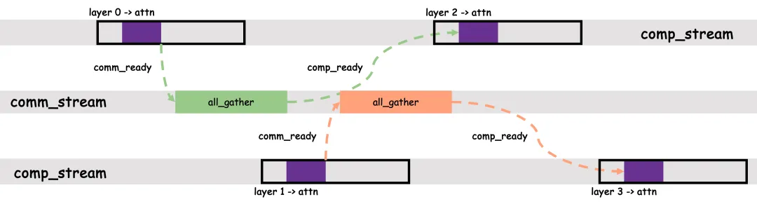 接下来我们考虑计算-通信流水线。当第i层attention计算完成时,我们立即发起非阻塞all gather操作,跨GPU收集第i+2层所需的权重分片。该预取操作与当前层的后续计算及第i+1层的计算并行执行,实现通信时延的有效隐藏。为保障计算正确性,奇数层与偶数层分别复用各自共享显存区,comp_stream和comm_stream间通过cuda event同步状态,如图4所示。在具体实现中,我们的统一管理两类cuda stream:comp_stream上完成所有计算,奇数层、偶数层的权重预取在各自的comm_stream上执行。我们通过适当的stream管理使得上述操作完美兼容cuda graph。
