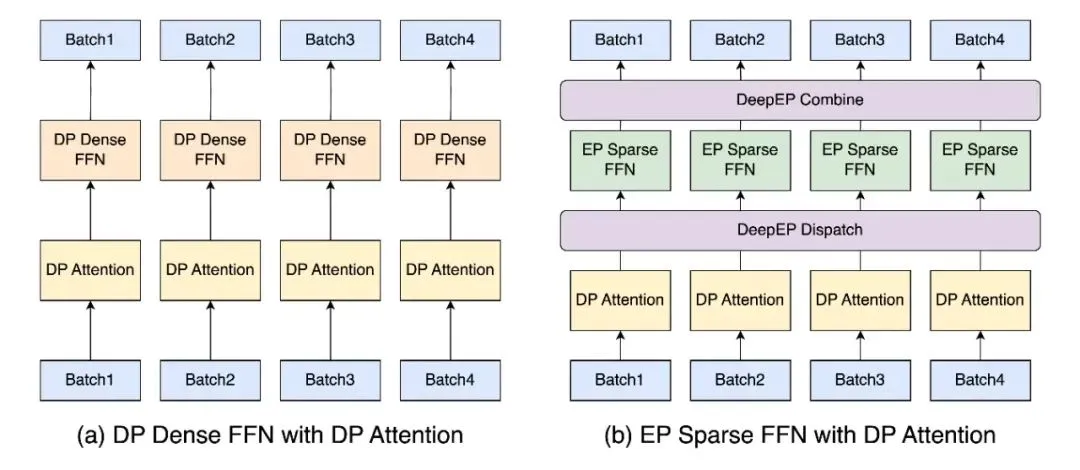 图1:DP attention混合并行部署方案 (图源https://lmsys.org/blog/2025-05-05-large-scale-ep/)