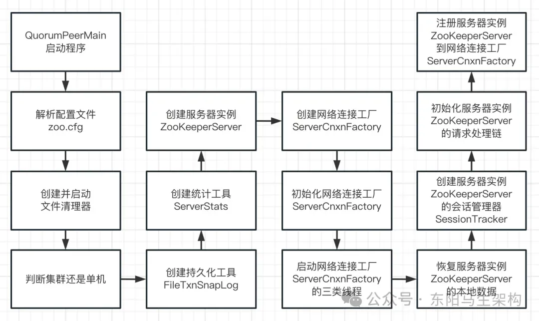 单机版zk服务端的启动,主要分为两个阶段:预启动阶段和初始化阶段,其启动流程图如下: