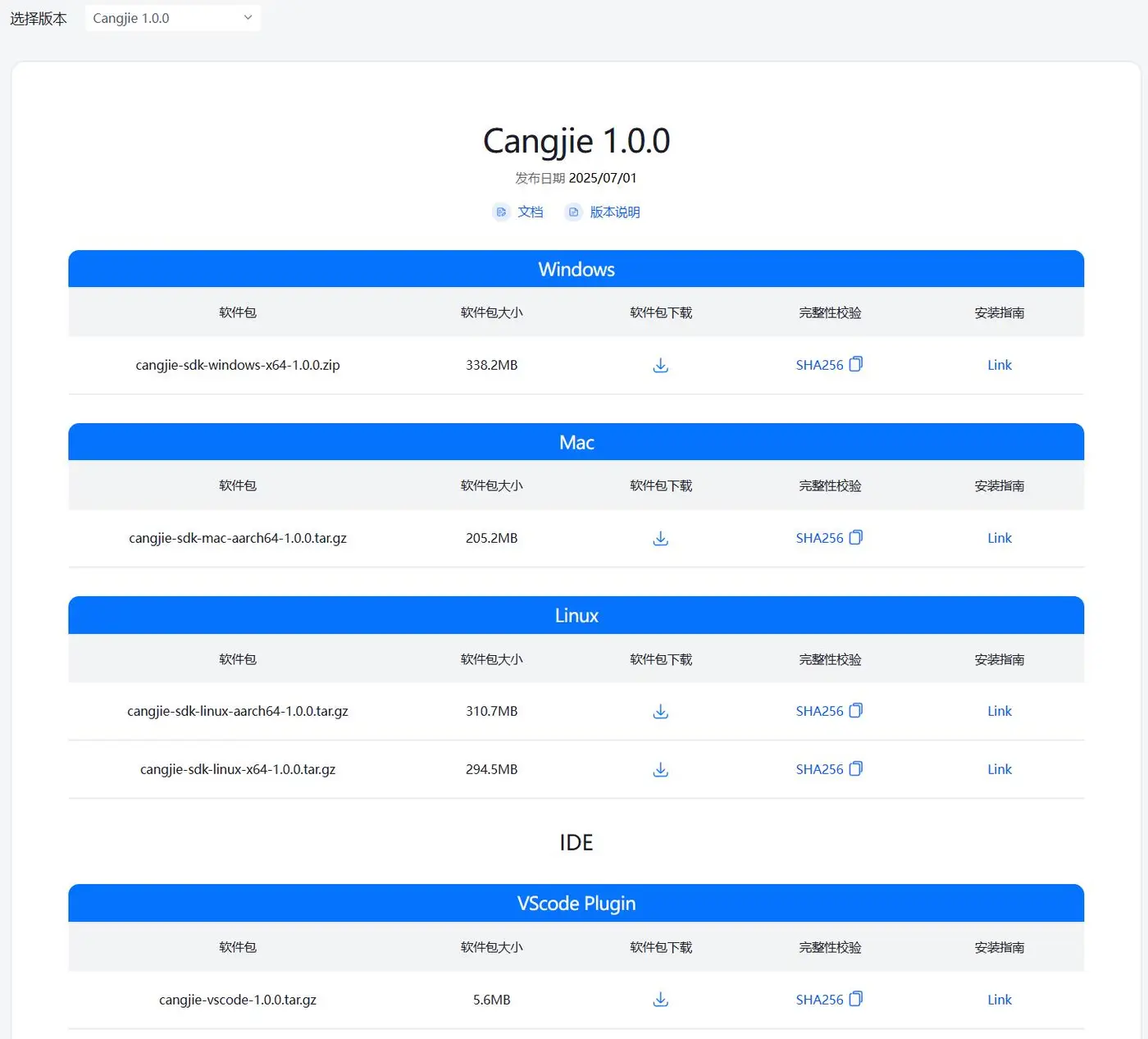 安装包在命名上更加规范了。安装包可以在https://cangjie-lang.cn/download,找到分为了仓颉SDK(仓颉工具链)和仓颉插件。