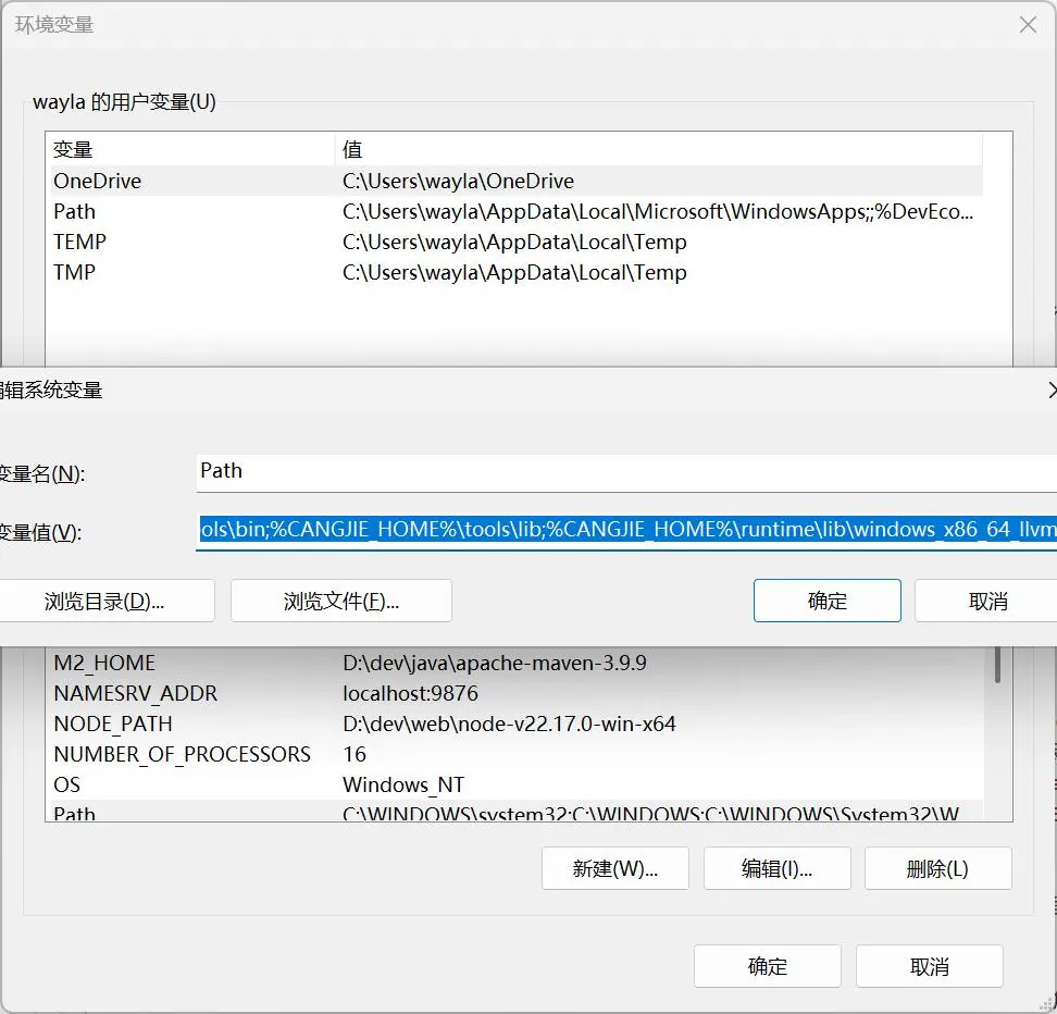 在“系统变量”(为系统所有用户进行配置)区域中,找到并选择 Path 变量,点击 “编辑” 按钮,进入 “编辑环境变量” 窗口。点击 “编辑文本” 按钮,附加以下内容;%CANGJIE_HOME%\bin;%CANGJIE_HOME%\tools\bin;%CANGJIE_HOME%\tools\lib;%CANGJIE_HOME%\runtime\lib\windows_x86_64_llvm。设置完成后可能需要重启命令行窗口或重启系统以让设置生效。