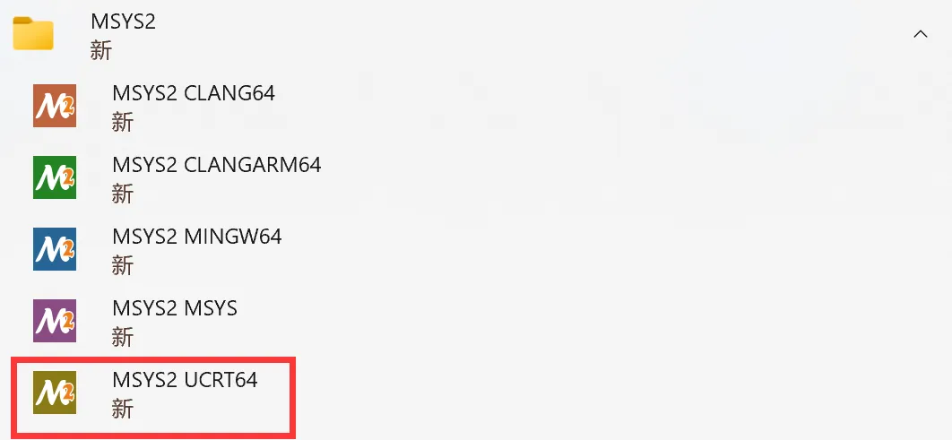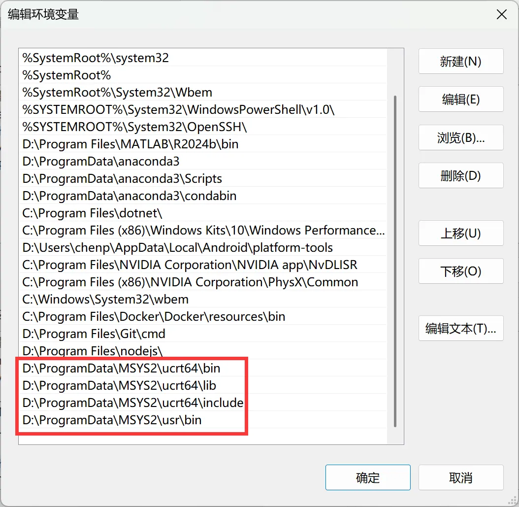 安装完成后我们打开MSYS2安装目录,将ucrt64目录下的bin,include,lib文件夹以及usr目录下的bin文件夹添加到系统环境变量的Path中: