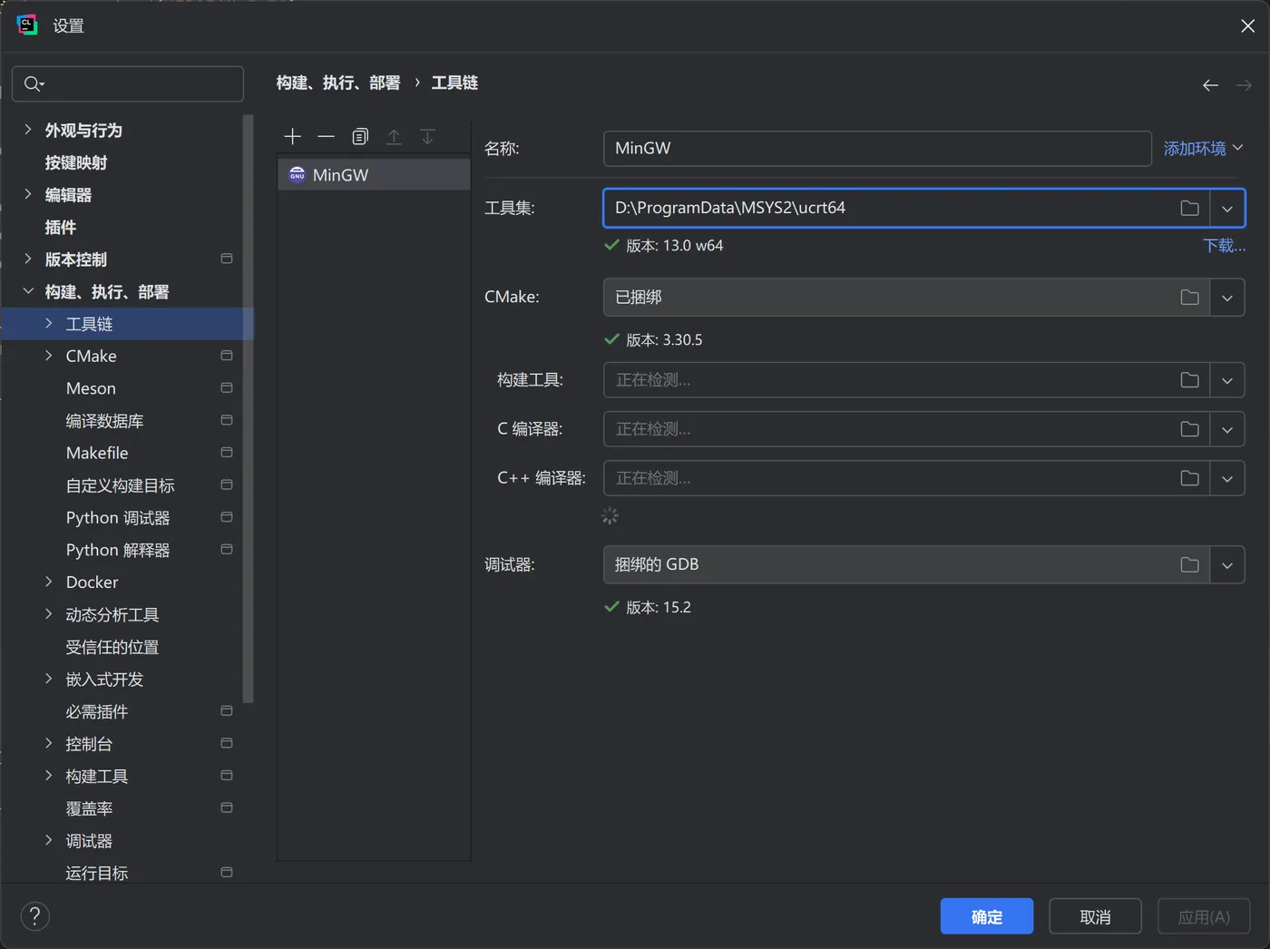 首先将构建、执行、部署 -> 工具链下MinGW的工具集路径改为MSYS的ucrt64路径,如图: