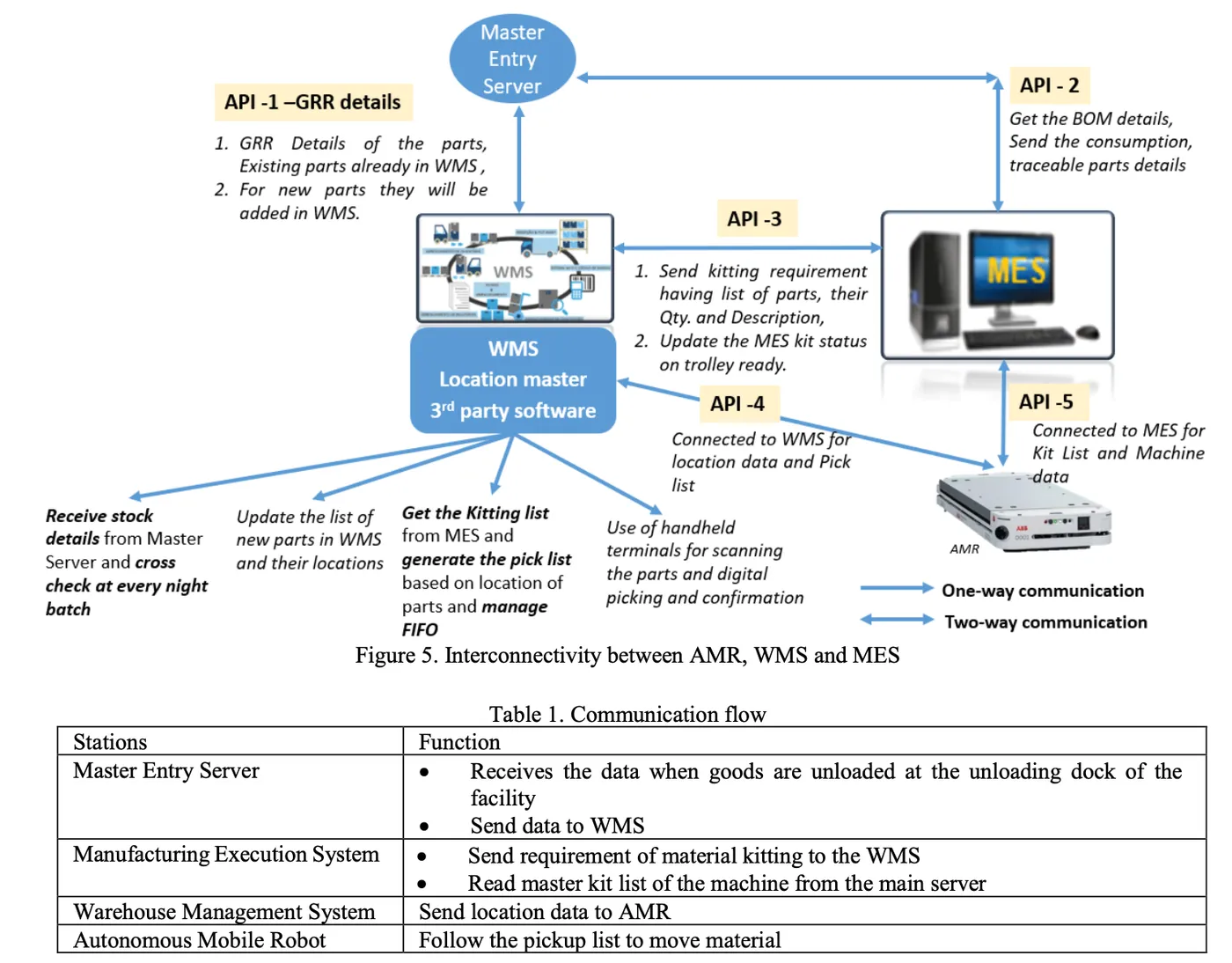 图5展示了AMR、WMS与MES之间的操作通信流程。制造设施中连接系统的数据流主要涉及主入口服务器、MES、WMS以及最终的AMR。所有关键单元的功能已列于表1中。主入口服务器在货物卸载至设施卸货码头时接收数据,随后通过API-1将包含零件详情及数量的信息发送至WMS。这些零件会被添加至库存,并根据可用空间分配至仓库特定位置。设施通过主服务器接收新客户订单,主服务器存储所有机器的BOM及配置信息。当接收到新订单时,该机器的BOM会通过API-2发送至MES,MES根据生产主管为不同阶段制定的生产计划生成车间物料需求。MES再通过API-3将物料配给需求发送至WMS。WMS已基于现有数据生成拣选清单,并遵循FIFO协议。当各阶段物料准备好并装载至手推车后,系统会向MES发送信号,MES再向AMR系统发送物料需求指令。AMR通过API-5与MES连接,通过API-4与WMS连接,从WMS获取位置数据并遵循物料拣选清单。仓库操作员将物料装入手推车后,AMR将物料运送至车间所需工位,这一过程通过系统互联节省了大量时间。